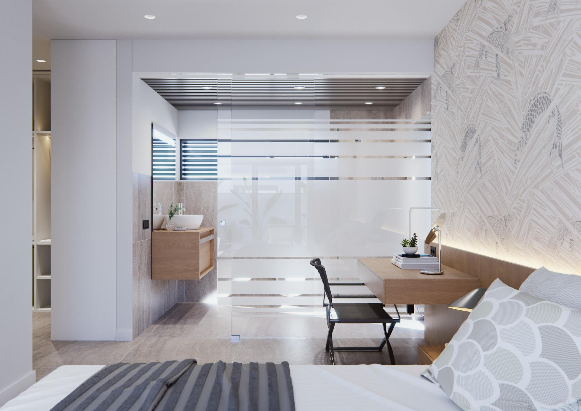 NY BYGGET VILLA PÅ EN GULV Tre eksklusive villaer i et boligområde i San Javier med 600 m2 tomt og 217 m2 bygget areal i en etasje, privat basseng og store hageområder. Bolig med arkitektonisk utforming basert på klare, kubiske og funksjonelle linjer i en eksklusiv boligklave i San Javier (Murcia). Automatiserte tilgangsdører til hage og garasje med infrarød fjernkontroll. Stor overbygd garasje for to kjøretøy med egen inngang. Hager med et vanndreneringssystem på gulvet, fullstendig ferdig og tilpasses, inkludert vegetasjon, vanning og belysning.